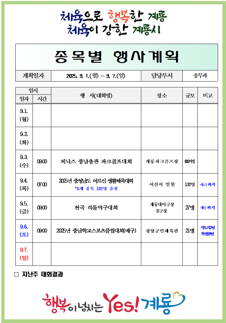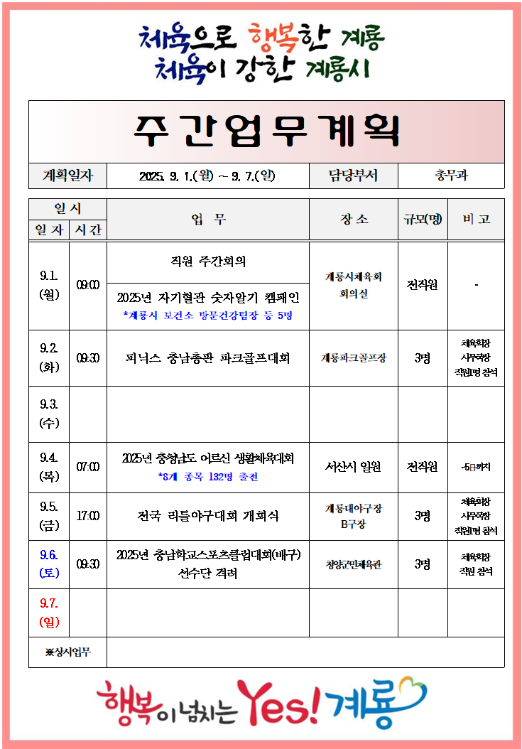 계룡시체육회 주간 계획, 행사 (9. 1. ~ 9. 7.) 페이지 정보 작성자 계룡시체육회 댓글 0건 조회 214회 작성일 25-09-01 10:20 목록 본문 [계룡시체육회 주간계획, 종목별 행사계획 안내]2025. 9. 1.(월) ~ 9. 7.(일)금주 계룡시체육회 주간계획, 종목별 행사계획을 알려드립니다.문의: 계룡시체육회(042-841-4992)#계룡시체육회 #주간계획 #주간업무 댓글 0 댓글목록 등록된 댓글이 없습니다.