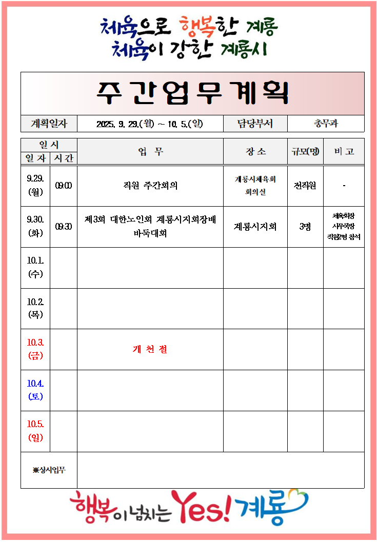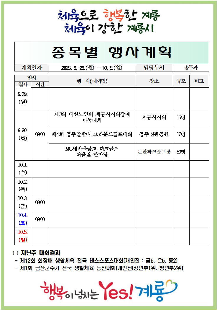 계룡시체육회 주간 계획, 행사 (9. 29. ~ 10. 5.) 페이지 정보 작성자 계룡시체육회 댓글 0건 조회 47회 작성일 25-09-29 16:41 목록 본문 [계룡시체육회 주간계획, 종목별 행사계획 안내]2025. 9. 29.(월) ~ 10. 5.(일)금주 계룡시체육회 주간계획, 종목별 행사계획을 알려드립니다.문의: 계룡시체육회(042-841-4992)#계룡시체육회 #주간계획 #주간업무 댓글 0 댓글목록 등록된 댓글이 없습니다.