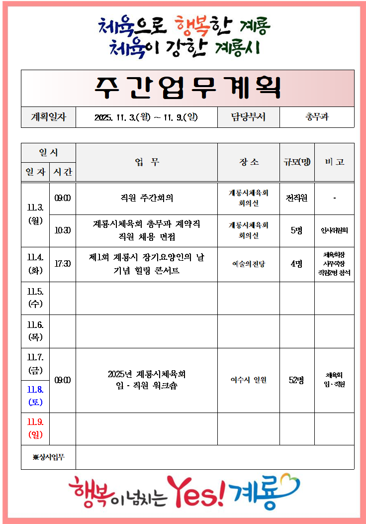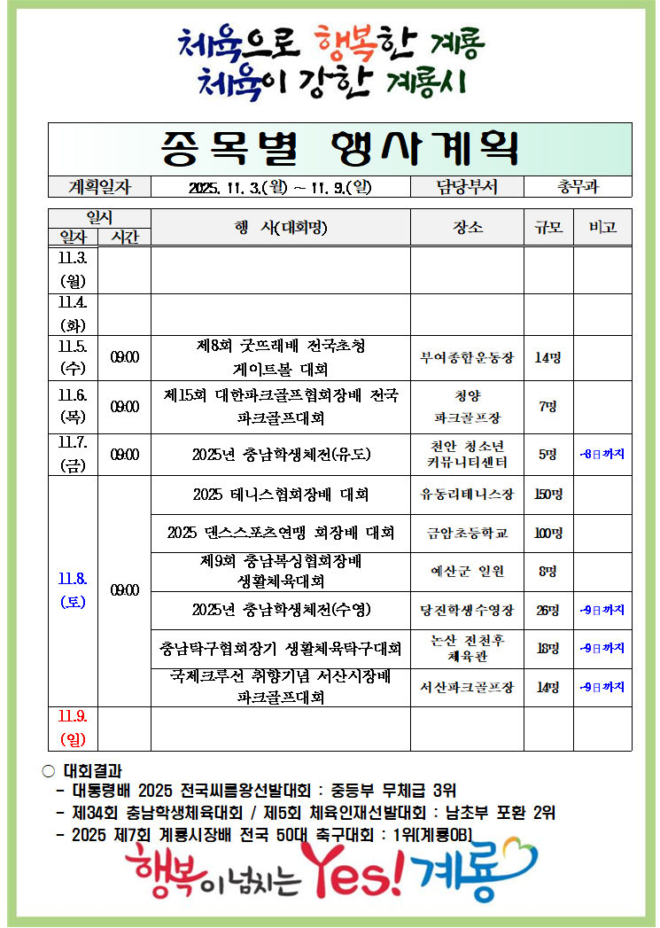 계룡시체육회 주간 계획, 행사 (11. 3. ~ 11. 9.) 페이지 정보 작성자 계룡시체육회 댓글 0건 조회 100회 작성일 25-11-03 16:39 목록 본문 [계룡시체육회 주간계획, 종목별 행사계획 안내]2025. 11. 3.(월) ~ 11. 9.(일)금주 계룡시체육회 주간계획, 종목별 행사계획을 알려드립니다.문의: 계룡시체육회(042-841-4992) 댓글 0 댓글목록 등록된 댓글이 없습니다.
